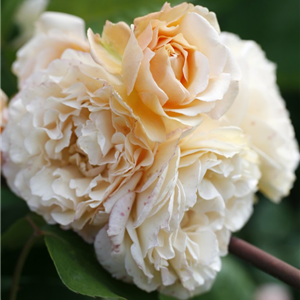 This repeat-flowering modern shrub has a graceful rounded habit and reaches over 1.75m. In summer, trusses of pale apricot, perfumed blooms are set against dark, shiny leaves with a tint of purple. It will repeat magnificently in autumn. Some say the flowers remind them of powder puffs! Can withstand bad weather.