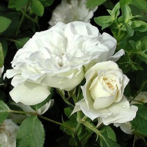 Fragrant, pure white, double flowers held against dark green foliage. Good for the front of the border and in pots. Height to 30-40 cm high, 40 cm wide.