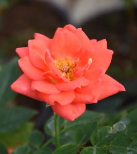 An upright, miniature bush rose, mid green foliage with mildly fragrant, rosette-shaped, double, orange/red flowers produced from june until the Autumn. 30cm high.